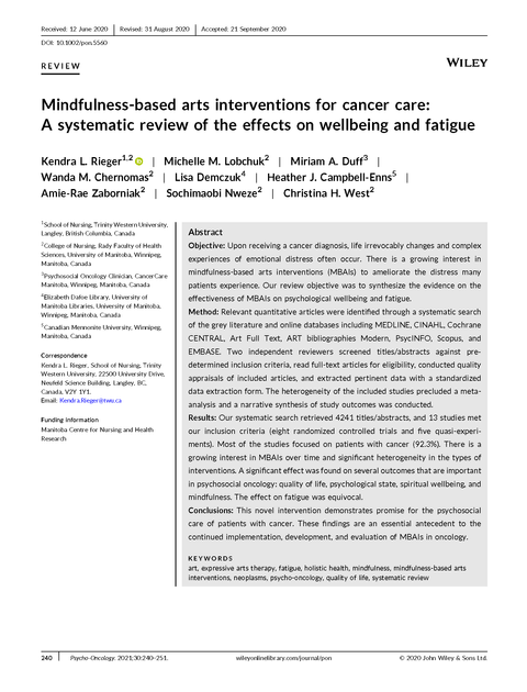 This stream builds on a systematic review and early study exploring how patients processed their cancer experiences through an expressive arts group at CancerCare Manitoba. Upon receiving a cancer diagnosis, life irrevocably changes, and complex experiences of emotional distress often occur. Our research explored how patients with cancer experience, utilize, and draw meaning from an expressive arts group. The 32 participants —who were post-treatment and in a period of transition—found that by practicing mindfulness and expressing themselves through art, they were, in fact, embarking on a transformative process of restoration. Mindfulness practices enabled participants to let go of their ruminations and calm their minds so they could fully engage in expressive arts activities and then express hidden emotions and difficult experiences in new ways. The group facilitated several unique meaning-making processes, and many patients described spiritual experiences they had in the group.